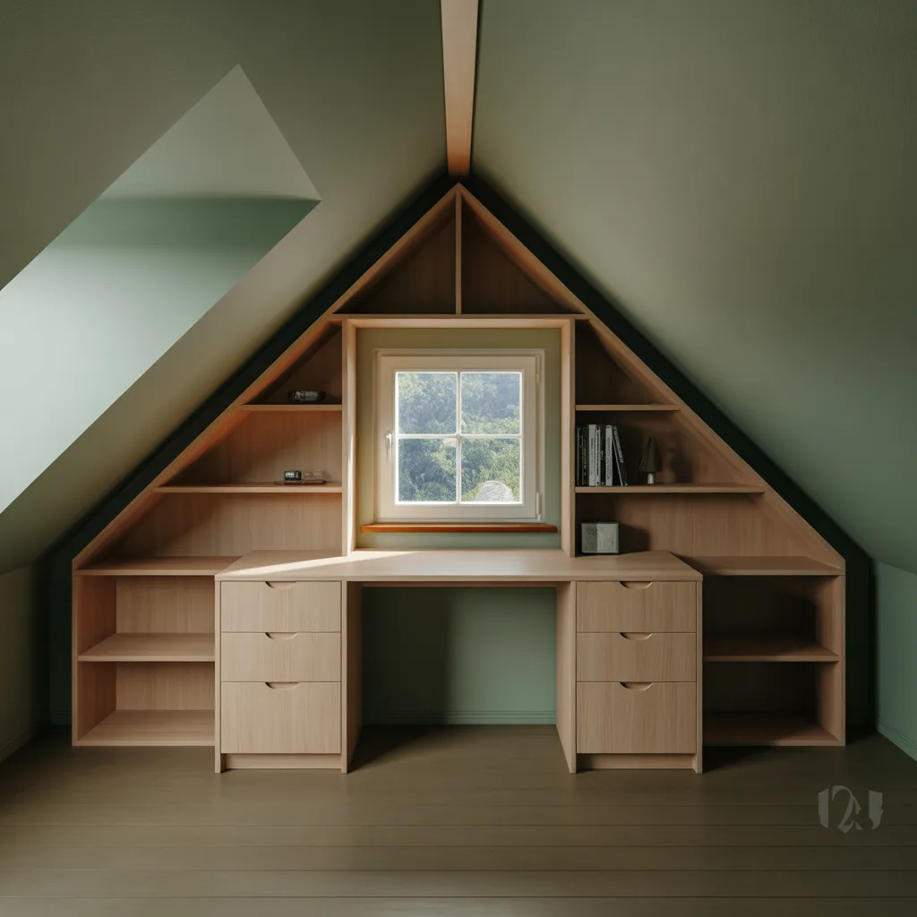 A wide interior shot of an attic home office built-in fitted under a sloped ceiling, custom desk and shelving shaped to match roof angles in light oak finish, small window allowing natural daylight to enter and create soft shadows along angled surfaces, compact yet functional layout, real attic environment with visible beams and textures, cozy and creative mood, shot on Canon EOS R5 with 24mm lens, color palette of light wood, warm white, and soft grey, photorealistic interior photography with authentic depth and lighting, ultra-detailed 8K photorealistic cinematic color grading sharp focus rule of thirds clean composition no watermark no logo magazine cover quality award-winning photography.