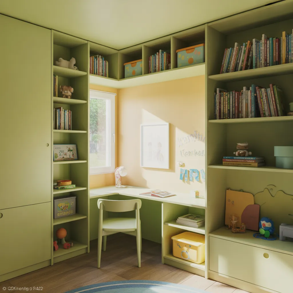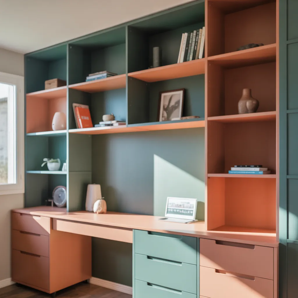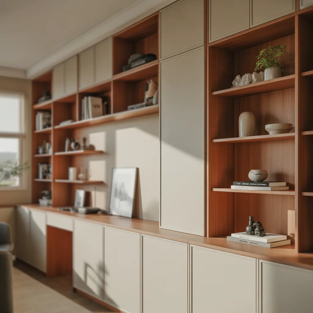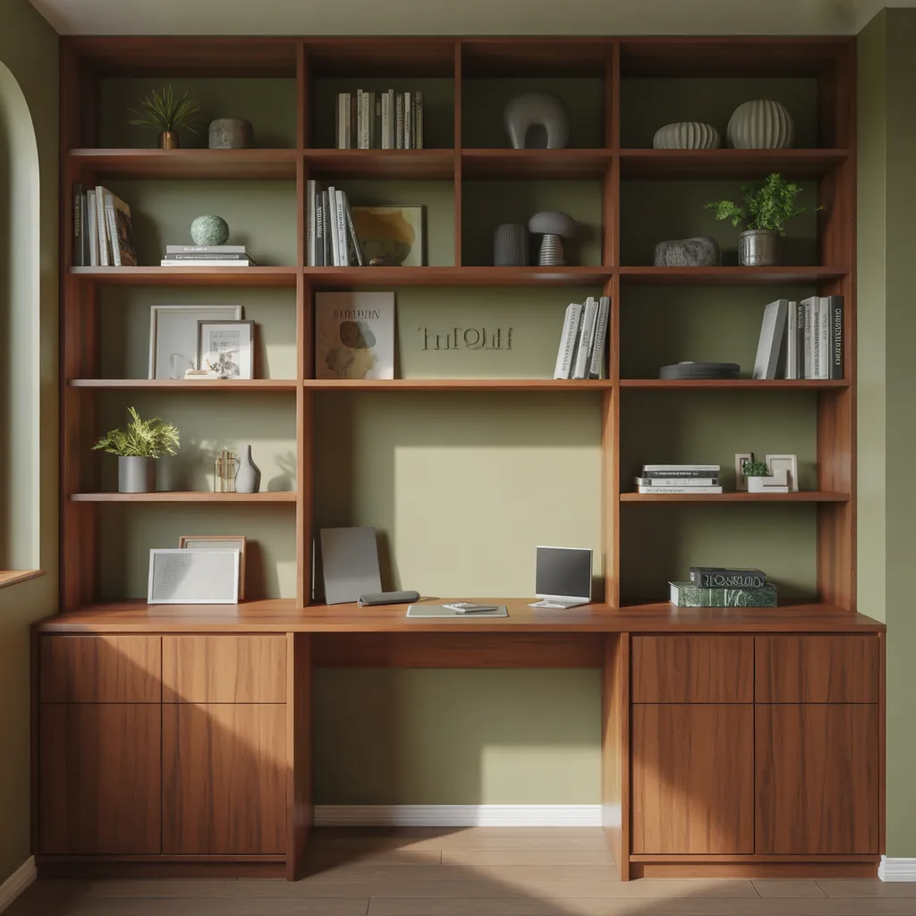 A medium-wide interior shot of a home office built-in featuring open shelving units in warm oak finish, shelves displaying books, plants, and decor items neatly arranged, central desk area simple and clean, natural daylight from the side highlighting textures and creating gentle shadows, real home environment with depth and realistic styling, open and accessible mood, shot on Canon EOS R5 with 24mm wide lens, color palette of warm oak, soft green, and muted beige, photorealistic interior photography with real material detail, ultra-detailed 8K photorealistic cinematic color grading sharp focus rule of thirds clean composition no watermark no logo magazine cover quality award-winning photography.