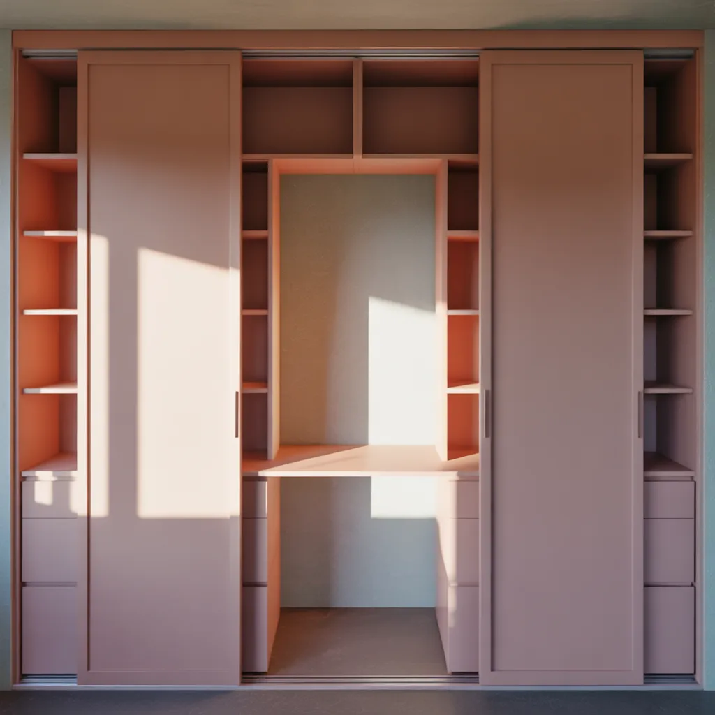 A medium interior shot of a home office built-in with sliding doors in soft wood finish gliding along sleek tracks, partially open to reveal shelves and storage behind, central desk area kept minimal, natural window light casting soft highlights on door surfaces, real home setting with visible depth and textures, practical and modern mood, shot on Canon EOS R5 with 24mm wide lens, color palette of warm wood, soft taupe, and muted cream, photorealistic interior design photography, ultra-detailed 8K photorealistic cinematic color grading sharp focus rule of thirds clean composition no watermark no logo magazine cover quality award-winning photography.