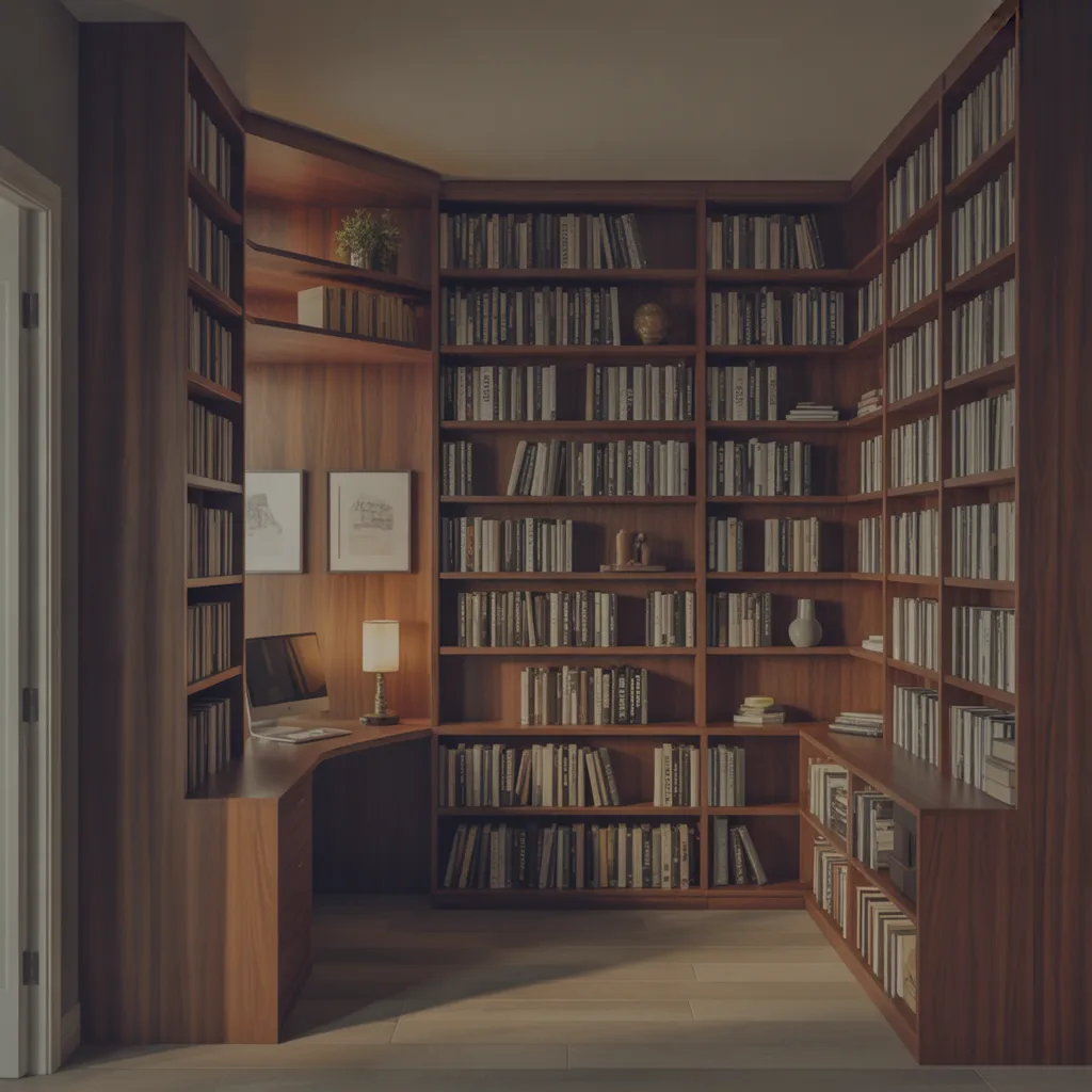 A wide interior shot of a library-style home office built-in with floor-to-ceiling bookshelves in deep walnut wood surrounding a central desk, shelves filled densely with books creating a study-like atmosphere, warm ambient lighting highlighting book spines and wood grain, natural daylight softly entering from the side adding depth, real home office setting with layered textures and shadows, quiet and focused mood, shot on Canon EOS R5 with 24mm wide lens, color palette of dark brown, warm amber, and muted gold, photorealistic interior design photography, ultra-detailed 8K photorealistic cinematic color grading sharp focus rule of thirds clean composition no watermark no logo magazine cover quality award-winning photography.