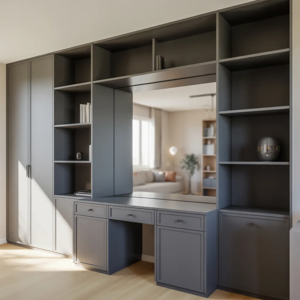 A clean interior shot of a modern gray home office built-in with matte charcoal cabinetry, a sleek integrated desk, and open shelving sections displaying minimal decor, soft diffused daylight evenly lighting surfaces and reducing glare, subtle reflections adding depth, real home environment with natural textures and soft background blur, balanced and calm mood, shot on Canon EOS R5 with 24mm lens, color palette of charcoal grey, soft white, and warm beige, photorealistic interior photography with realistic lighting behavior, ultra-detailed 8K photorealistic cinematic color grading sharp focus rule of thirds clean composition no watermark no logo magazine cover quality award-winning photography.