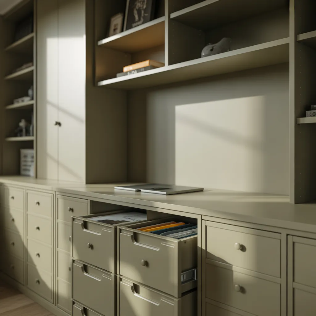 A wide interior shot of a home office built-in with hidden cabinets in smooth matte grey finish, seamless doors without visible handles blending into the wall, central desk area kept minimal and clean, cabinets closed to maintain a clutter-free look, soft natural daylight creating subtle reflections across surfaces, real home environment with depth and soft shadows, modern and calm mood, shot on Canon EOS R5 with 24mm wide lens, color palette of soft grey, warm white, and muted taupe, photorealistic interior photography with realistic textures and lighting, ultra-detailed 8K photorealistic cinematic color grading sharp focus rule of thirds clean composition no watermark no logo magazine cover quality award-winning photography.