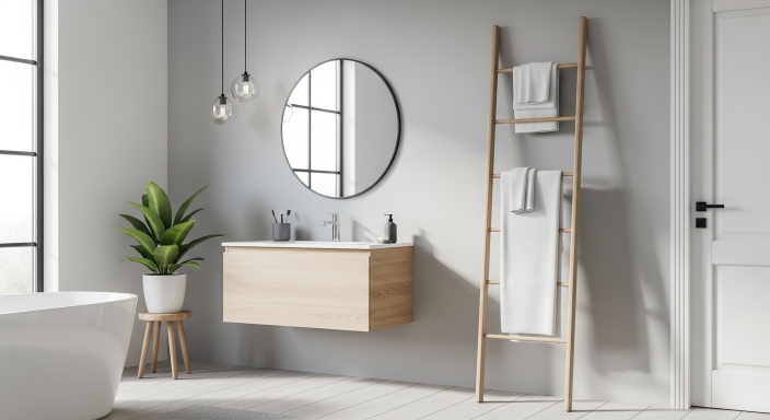 A wooden ladder can be turned into a stylish towel rack. Simply lean it against the wall and hang towels on each step. It looks natural and modern at the same time. This idea works well in minimalist or farmhouse-style bathrooms and saves space compared to traditional racks.
